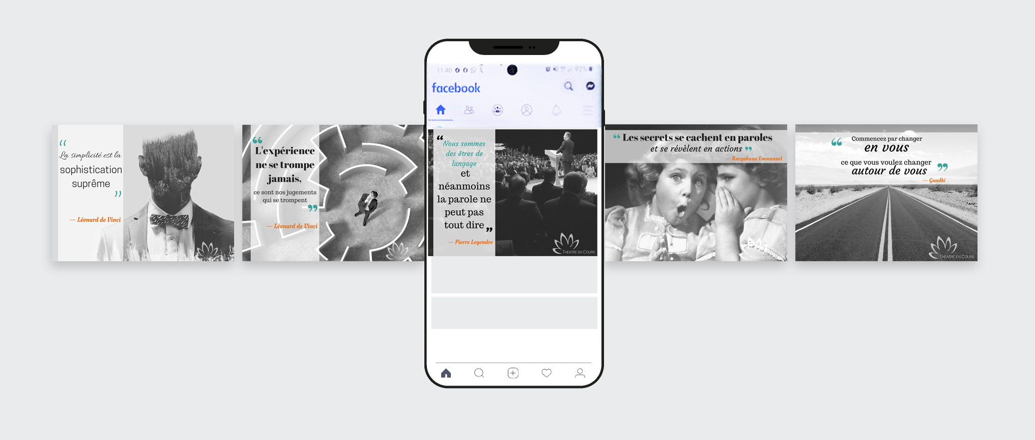Théâtre en cours Le théâtre comme outil de développement – Ateliers et formations de l’insertion par la prise de parole Brochure / Print SiteWeb Prise de vue, nuageTag et WeDdesign Posts / Facebook Contenus textuels et visuels